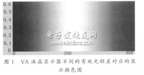 在不加电状态下,VA 液晶显示器是利用上下两个偏振片正交获得极低的暗态;在加电状态下,垂直入射的可见光光线与液晶分子存在45°的夹角,在有效光程差等于1/2 可见光波长时,得到最佳的亮态显示。有效光程差,是指在电场作用下,液晶分子旋转后,整体液晶分子所体现出来的光程差。有效光程差不同于调配液晶的理论光程差。理论光程差(简称光程差),是指在理想电场作用下,液晶分子由垂直状态完全旋转成平行状态,整体液晶分子所体现出来的光程差。