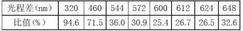 由图1 可总结出,在有效光程差较小时,可见光的各波长比较聚集,颜色只有黑白两色。在有效光程差300nm 附近出现一亮态极大值,之后随着有效光程差的增大,不同波长的相位差差别越大,其亮态峰值将越来越小。