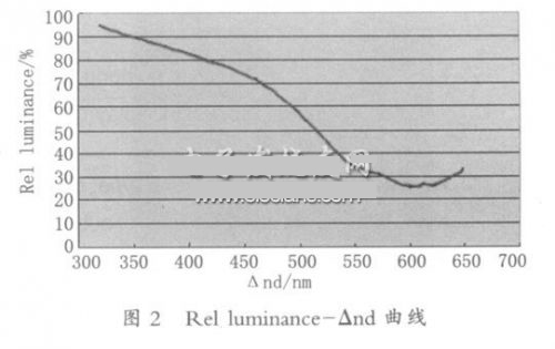 采用本试验总结出的以上Rel luminance- Δnd曲线,对于某一未知光程差的VA 液晶显示器,只需简单测试出高压光电曲线,得出高压显示亮度与最大值显示亮度的比值,然后对照图2 所示的曲线,就可准确得出相应的光程差值。