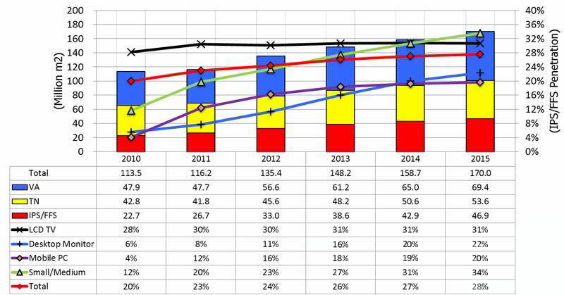 IPS/FFS广角技术正为大部分平板终端所采用。其结果是IPS/FFS液晶面板在移动电脑市场上的份额不断增加,该份额到2015年将增至20%。而在IPS/FFS液晶面板已经普及的液晶电视市场上,2011年的份额会占到30%。