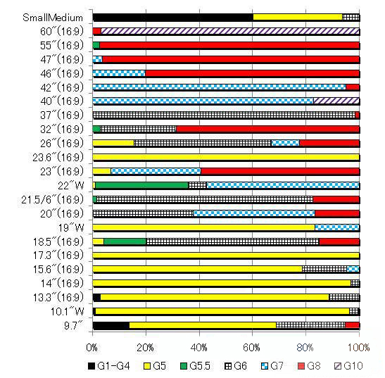 图2:TFT液晶面板分尺寸/分生产线代的生产份额(2011年)