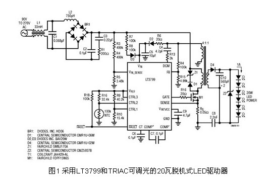创造更精小并具成本效益解决方案LT3799运用具整个LED驱动电路(包括电磁干扰滤波器)的单级设计,仅需要四十个外部组件,让解决方案简单、配置面积精小和具成本效益等优势。图1中20瓦电路的总尺寸仅为30毫米(mm)×75毫米,厚度仅为30毫米,非常适用于多种LED应用。透过改变几个外部组件,这个电路就可以进一步为120VAC、240VAC甚至377VAC应用或几乎任何常见的AC输入而优化。