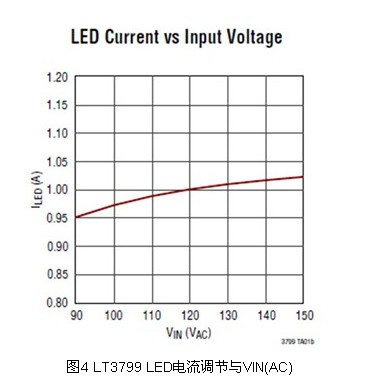 此外,LT3799在整个输入电压、输出电压和温度范围内提供LED电流调节。从图4可见,正如大多数美国照明应用所要求,当输入从90VAC变到150VAC时,LED电流保持在±5%的调节范围内。LT3799采用一个独特的电流检测电路取代了光耦合器,以向二次侧提供良好调节的电流。此举不仅降低了成本,还改善了可靠性。
