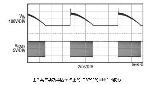 透过使线路电流跟随施加的正弦波电压,这种高功能整合的驱动电路实现了高功率因子,并且满足了IEC 61000-3-2 C类照明设备谐波要求。如果所吸取的电流与输入电压成正比,就能实现等于1的功率因子。其用一个从输入电压产生并与输入电压成比例的电压调制峰值开关电流。如图2所示,这种方法提供0.98或更高的功率因子。一个小带宽回馈环路保持对输出电流的调节,而且不会使输入电流失真。