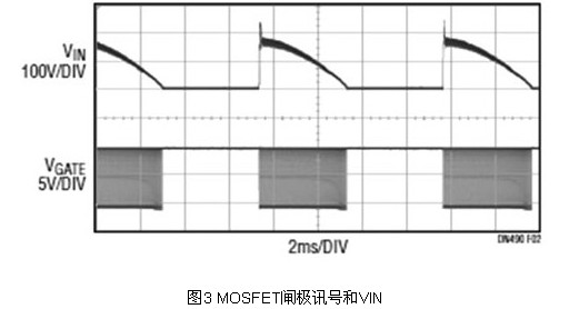 当TRIAC调光器处于断开状态时,其实不是彻底断开的。有相当大的漏电流通过其内部滤波器流至LED驱动器。这个电流为LED驱动器的输入电容器充电,进而导致LED随机开关和闪烁。过往的解决方案是增加一个泄能电路,该电路包括一个大且昂贵的高压金属氧化物半导体场效晶体管(MOSFET)。LT3799将变压器一次侧绕组和主开关用作泄能电路,因此无需这类MOSFET或其他任何额外的组件。如图3所示,当TRIAC断开时,MOSFET闸极讯号为高,且MOSFET接通,进而泄放掉漏电电流,并保持输入电压为 0伏特(V)。TRIAC一导通,MOSFET就无缝地变回正常的供电组件。