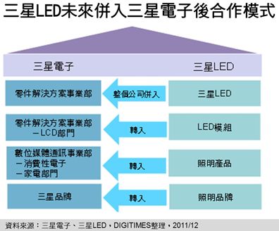 林芬卉说明,为提升三星LED事业竞争力,在三星电子(Samsung Electronics)组织改造之际,未来三星LED将纳入三星电子的「零件解决方案事业部」,且LED上、中、下游产业链与三星电子各事业部皆有合作关系,藉由共享资源方式以发挥综效。