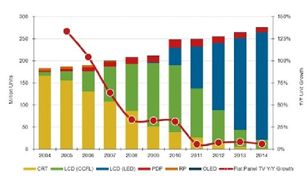 2004-2014全球电视按技术别出货量及预测(单位:百万台)