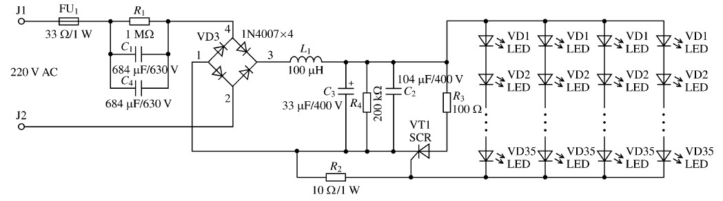 该电路共驱动140只白光LED (小功率) ,采用35串4并的模式,采用电容降压式驱动方式。其中, C1、C4 为并联的两个相同的电容,起降压及限流作用; 4个1N4007组成的整流桥对输入交流电压进行整流;滤波电容C3 用于滤除整流输出电压中的交流成分,使电压更为平滑; L1、C2 用于滤除输出电压中的高频成分;电阻R4 为C3 提供放电回路;采用单向晶闸管SCR729210对电路进行保护, R3 为限流电阻。
