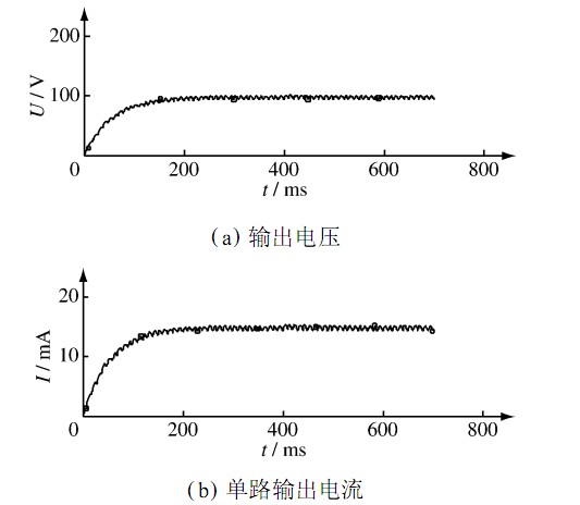 为理论上验证设计的可行性,采用PSp ice软件对电路进行了仿真分析。结果如图2所示。电路在210 ms时进入稳定状态,稳定后其输出电压为97 ±2. 2 V,输出电流为14. 7 ±0. 3 mA,基本验证了电路设计的可行性。LED 日光灯电路输出特性如图2所示。