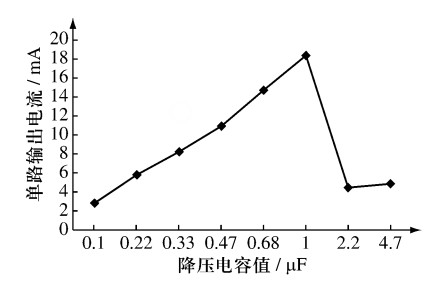 在不损坏LED的条件下进行了测试,降压电容C1 的电容值与输出电流的关系如图4所示(因为两个电容是相同的,图4中只表示出单一电容值)??杉?,随着电容值的增加,输出电流几乎呈线性上升,待增加到一定值时(约20 mA) ,?;さ缏菲鹱饔茫仁咕齃ED支路的电流下降。