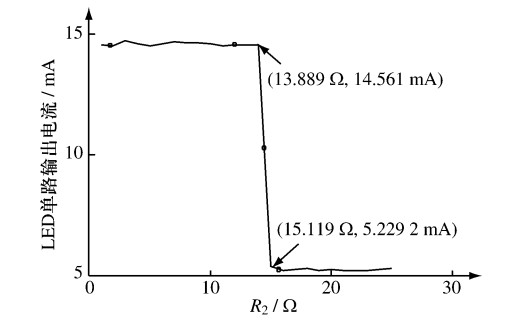 为验证输出?;さ缏返墓δ?,对电阻R2 进行参数扫描分析,之后进行性能分析。结果如图3所示??梢钥闯?,当R2 从1 Ω 增大到13. 889Ω时,输出电流开始下降,表明此时单向晶闸管处于临界导通状态;然后随着R2 的继续增大,输出电流急剧下降,直至R2 为15. 119Ω时,输出电流稳定在5. 2 mA 左右,表明单向晶闸管已经完全导通,保护电路已经起作用。