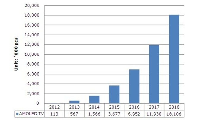 据NPD DisplaySearch分析,2011年OLED面板产值预计达40亿美金,约为所有平板显示器产值的4%;2018年则将创造超过200亿美金产值,达到了所有平板显示器产值的16%?此外, OLED应用在照明上也自2011年开始起飞,OLED照明预计到2018年将达到60亿美金产值。NPD DisplaySearch预测 AMOLED TV将于2017年达到1千万台以上的规模。虽然在AMOLED TV面板量产初期会有规模经济不够、量产稳定性不够以及成本过高等问题,但在电视品牌厂商追求产品差异化的动机之下,预计将会有策略性的AMOLED TV订价方式,以刺激终端市场消费者的购买动机。