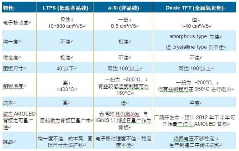表一、LTPS、Oxide与a-Si 背板特性比较:
