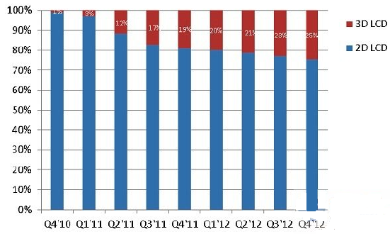 根据NPD DisplaySearch的调查,在元旦期间的主要城市卖场,3D液晶电视在零售终端渗透率甚至高达40%;而整体3D液晶电视出货渗透率可望在2012年第一季超过20%;该机构在全球电视出货与预测季报(Quarterly Advanced Global TV Shipment and Forecast Report)中预测,到2012年第四季,中国大陆 3D液晶电视渗透率可达25%。