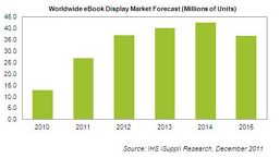 IHS iSuppli指出,2011年电子书阅读器显示器出货量将自2010年的一千三百万片,增长至二千七百一十万片,年增率高达108%;不过,2012年成长率预估将衰退至37%,出货量约达三千七百一十万片;至2015年更将出现首次出货量衰退的情形。