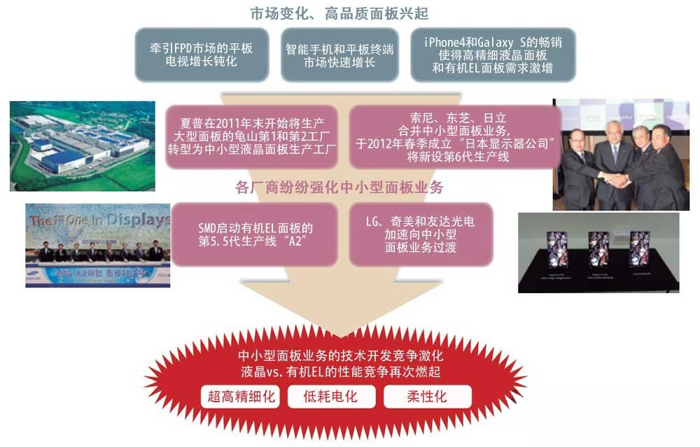 日韩台的面板厂商开始将业务重心从电视机用大型面板转向智能手机和平板终端使用的中小型面板。今后,技术开发竞争将越来越激烈。