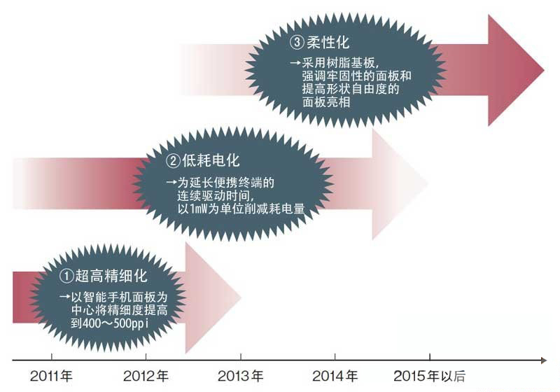 ①超高精度化的目标是,能在智能手机面板上显示1920×1080像素的全高清影像。为此,需要将分辨率由目前的330ppi提高至400~500ppi。②低耗电量化方面,为延长便携终端的连续驱动时间,需要以1mW为单位不断削减耗电量。③柔性化方面,为实现具有高坚固性和高形状自由度的面板,需要采用树脂基板。