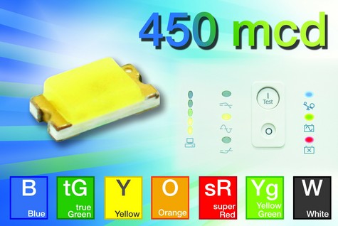 VLMx1300系列中的所有LED都安装在1.6 mm x 0.8 mm x 0.55 mm的高可靠PCB板上,具有130°的极宽视角。颜色包括大红、浅橙色、黄色、黄绿色、纯绿色、蓝色和白色。这些彩色LED使用超亮的AllnGaP和InGaN技术(根据颜色采用不同的技术),在20mA正向电流和最高3.8V的正向电压下,发光强度高达450mcd。蓝色LED具有一个ESD防护能力高达8000V的?;ざ堋T?mA正向电流和3.15V的最高正向电压下,白色LED的最高发光强度达180mcd。下表列出了各个型号的性能特性。