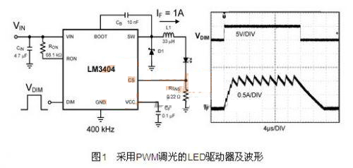 无论LED是经由降压、升压、降压/升压或线性稳压器驱动,连接每一个驱动电路最常见的线程就是须要控制光的输出。现今仅有很少数的应用只需要开和关的简单功能,绝大多数都需要从0~100%去微调亮度。目前,针对亮度控制方面,主要的两种解决方案为线性调节LED的电流(模拟调光)或在肉眼无法察觉的高频下,让驱动电流从0到目标电流值之间来回切换(数字调光)。利用脉冲宽度调变(PWM)来设定循环和工作周期可能是实现数字调光的最简单的方法,原因是相同的技术可以用来控制大部分的开关转换器。
