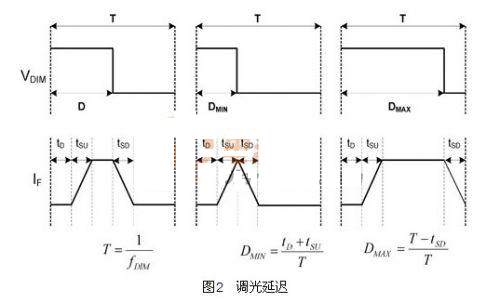 对于PWM调光讯号而言,每个LED都有限定的响应时间,图2表示三种不同的延迟,延迟愈大者表示能达到的对比度就愈低(对光强度控制的一种测量方法)。