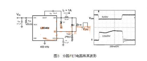 从一个没有输出电容器的快速降压稳压器着手,出现在输出电流开启和关闭的延迟,是来自集成电路本身的传导延迟和输出电感器的物理特性。若要达到真正高速的PWM调光,两个延迟都须被略过(By Pass)。要实现这个目标,最佳方法就是采用一个与LED并联的电源开关(图3)。当LED关闭时,驱动电流便会分流通过开关,作用就如同一个典型的N型金属氧化半导体场效晶体管(N-MOSFET),这时集成电路会继续运行,而电感器电流也会持续流动。该方法的最大缺点在于LED关闭时,即使期间的输出电压下降到与电流感测电压相同,仍会浪费功率。