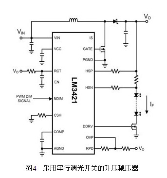 假如真的需要一个快速的PWM调光,最佳的解决方案是采用两级系统,并以降压稳压器作为第二级LED驱动级。不过,若尺寸空间和成本都不容许,退而求其次的最佳选择便是图4中的串行开关。