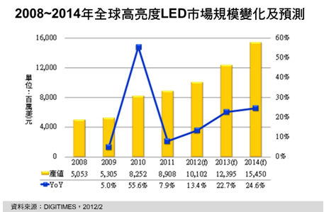 - 2012年全球高亮度LED产值年成长率将为13.4%