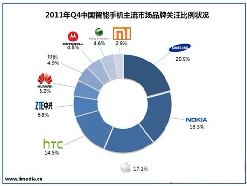 2011Q4中国智能手机市场主流市场品牌关注比例状况