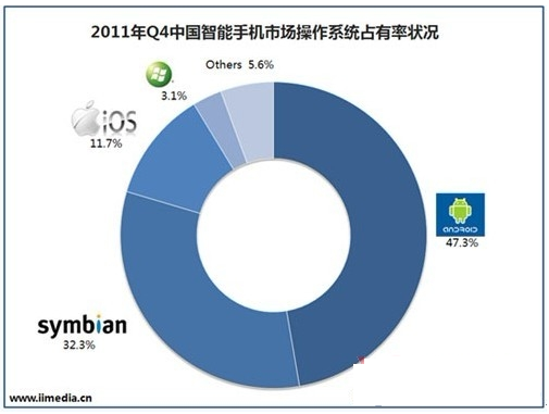 报告还显示,在中国智能手机操作系统市场占有率方面,2011Q4中国智能手机市场主流的操作系统中,Symbian占32.3%,iOS占11.7%,而Android的表现非常令人欣喜,已经飙升到47.3%,达到历史空前水平。