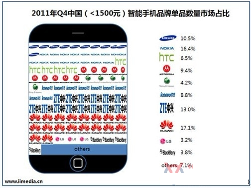 在智能手机市场品牌占有率状况方面,艾媒咨询数据显示,2011年第四季度中国智能手机市场诺基亚、三星、苹果分别占有32.9%、17.3%、11.7%。艾媒分析认为,虽然诺基亚智能手机凭借其良好的寿命,仍占市场1/3强,但是诺基亚的市场份额正在持续萎缩;而三星、苹果等海外品牌发展迅猛;华为为首等一批国产手机品牌通过和运营商合作推出“千元智能手机”而逐渐扩大市场份额。