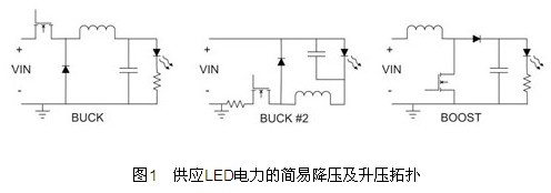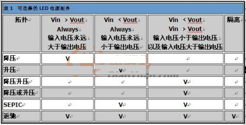 表1的信息可供作选择LED驱动器最佳切换拓扑的参考。除了这些拓扑之外,也可以使用简单的电流限制电阻或是线性稳压器,不过这些方法通?;岷挠霉喙β省J淙氲缪狗段?、驱动的LED数目、LED电流、隔离、电磁干扰(EMI)限制以及效能,都是相关的设计参数。大部分的LED驱动电路可分为以下几种拓扑类别:降压、升压、降压升压、SEPIC以及返驰。