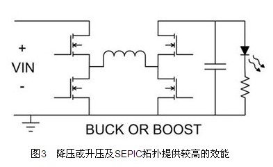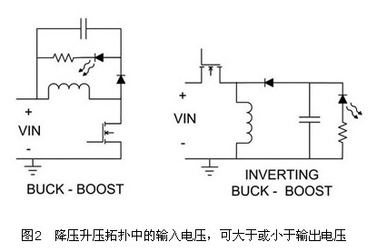 图2显示两种降压升压电路,可在输入电压可能大于或小于输出电压的情形下使用。这些电路与前述两种降压拓扑有相同的折冲特点,与电流侦测电阻与门极驱动的位置有关。图2的降压升压拓扑,显示接地参考的闸极驱动。此拓扑需要位准移位电流侦测讯号,不过反向的升压降压拓扑则具有接地参考的电流侦测及位准移位闸极驱动。如果控制IC与负输出有关,且电流侦测电阻与LED进行交换,即可利用有效的方式配置反向升压降压拓扑。只要适当控制IC,即可直接测量输出电流,也可以直接驱动MOSFET。