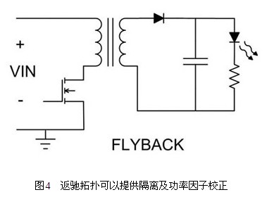 基于安全考虑,可能会规定在脱机电压及输出电压之间进行隔离。此应用方式下,最节省成本的解决方法就是使用返驰转换器(图4),在所有的隔离拓扑中,这种作法所需要的组件数量最少。变压器匝数比可用来对输出电压进行降压、升压或降压升压,设计弹性很大,不过缺点在于电源变压器基本上是订制组件。此外,在FET以及输入和输出电容器中,也会有高组件应力的情形出现。应用固定灯光时,可以使用「慢速」的回馈控制循环,调节LED电流与输入电压同相位的情形,进行功率因子校正(PFC)。这样可以调节所需的平均LED电流,并能调节输入电流与输入电压同相位的情形,以提供高功率因子。
