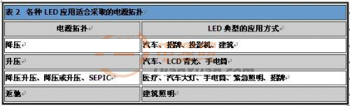如同表2所示,LED已广泛运用于各领域,因此需要许多种类的电源拓扑,支持LED的应用。一般而言,必须考虑输入电压、输出电压及对隔离的需求,以做出适当选择。