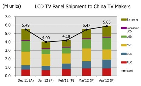 图一、Dec’11~Apr’12电视面板出货至大陆电视厂商的数量