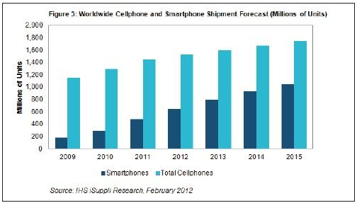 IHS公司的资深首席分析师Steve Mather 认为,2015年全球手机销量将达17亿部,其中10亿部将是智能手机。这意味着2015年超过70亿的人口中,14%将购买智能手机,如图3所示。这个规模十分惊人,全球科技供应链纷纷调整方向,脱离电脑产业,投身于智能手机市场。时间框架:三年。