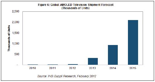 据IHS iSuppli公司的中小显示器研究报告,2015年全球AMOLED电视出货量预计将达到210万台,而2012年只有3.4万台。虽然增幅巨大,但到2015年AMOLED电视在全球平板电视市场中的份额仍然将只有1%。