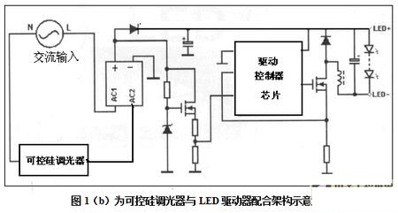 所以它是LED照明常用方法,见图1(b)所示可控硅调光器与LED驱动器配合架构示意。