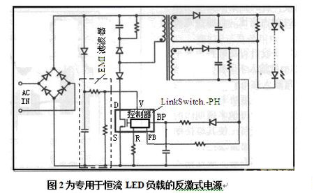 应该说如今有多种类型控制器可以构建恒流LED驱动电源-LED负载的反激式电源。在此仅以集成多项控制器LinkSwitch.-PH构建的LED驱动器为例作分析。