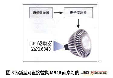 MAX16840具有的应用特征是LED换代灯构建技术的保证。MAX16840 集成MOSFET LED驱动器,可用于MR16及其它12V交流输入灯。它采用独特的技术控制灯管的输入电流,对输入电流进行整形,可使用大多数电子变压器和调光器支持无闪烁工作,很好地解决了上述“问题的提出”之困扰。