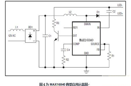 而MAX16840芯片有3个重要引脚功能:FB引脚电压可检测输入电流,并调节其平均值;而输入引脚(REFI)用于设置输入电流值,引脚电压低于特定门限时,输入电流与该电压成正比,电压超过特定门限时,输入电流将置于固定的预置水平。据此利用REFI的非线性特性,连接一个NTC电阻,即可得到热折返?;?;IN引脚具有内部过压保护,避免内部开关MOSFET在LED串开路或LED串电压过高时损坏;它带有一个独立的EXT引脚,确保低输入电压开启时提供一个触发启动电流,以配合电子变压器正常工作。EXT驱动外部npn晶体管,一旦IN跌落到5.5V UVLO门限以下,将EXT拉至地电平,外部npn晶体管关断。其IC采用3mm x 3mm、10引脚、TDFN封装,-40°C至+125°C工作温度范围。图4为MAX16840典型应用示意图。它被广泛应用于MR16及其它12V交流或直流输入LED照明之中。