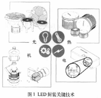 LED 的封装技术实际上是借鉴了传统的微电子封装技术,但LED 有其独特之处,又不能完全按照微电子封装去做。整个LED 封装工艺主要包括封装原料的选取、封装结构的设计、封装工艺的控制以及光学设计与散热设计,概括来讲就是热- 电- 机-光(T.E.M.O.),如图1 所示,这是LED封装的关键技术。