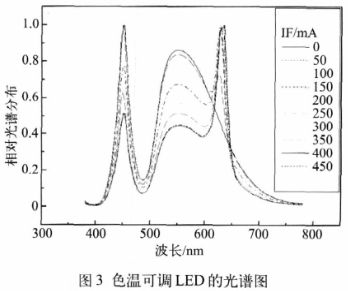 图3为采用远方HASS-2000高精度快速光谱辐射计测量得到的色温可调LED 的光谱图,从图中可以看出,随着红光LED 电流的变化(从0 到450mA),LED 的相对光谱也会随之变化,LED 的光谱有三个峰值,分别在450nm、550nm和628nm,暖色温的发光效率大于68lm/W,冷色温的发光效率达到87lm/W。