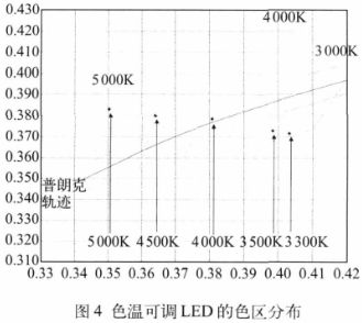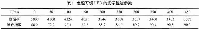 图4 列出了色温可调LED 的色区分布随红光LED 电流的变化,表1 列出了色温可调LED 的光学性能参数随红光LED 电流的变化,可以看出,红光LED 不加电流的情况下,LED 的色温为5 000K,在冷色温BIN区,随着红光LED电流的逐渐增加,LED???/a>的色温会呈现一个连续的变化,从冷光5 000K到暖光3 375K,同时LED 的显色指数会逐渐升高,最高可达90 以上,完全能够满足照明场所对显色指数的要求。