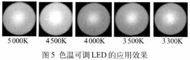 集成封装的LED,由于工作电流较大,工作时产生大量的热量,积聚在pn 结内部的热如不及时传导出去,将导致器件温度升高,温度对LED的性能产生重要的影响,如色温变化、波长红移、正向压降等。图5 所示为色温可调LED的应用效果,将封装好的色温可调LED??榘沧暗?00mm筒灯上,红光LED加上不同的电流,得到筒灯的发光效果。筒灯连续点亮30min 后,测试筒灯上散热器温度为38℃,铝基覆铜板上的温度为38.5℃(室温25.2℃),说明色温可调LED 具有良好的散热性能。