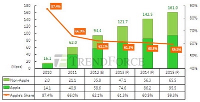 在苹果的iPad 3即上市的的之际,2012年平板计算机市场的争夺战才算正式开打,根据产业研究机集邦科技(TrendForce)统合旗下WitsView(面板)、DRAMeXchange(NAND Flash)的研究数据,预估在2012年时全球平板计算机销量将可望达到9,400万台,比起2011年的6,200万台,年成长达53.1%,在平板计算机的销售量上,苹果仍将维持前二年的强势地位,其iPad将占市场六成以上,达5,900万台。