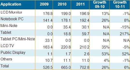 笔记本电脑与公共显示器依旧维持较佳表现,分别有8%与52%的出货成长。平板电脑尤其是苹果iPad的强劲出货态势,使平板电脑面板在2011年出货接近6千万片,较2010年大幅成长21%。
