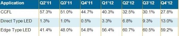 表二 、Q2’11~Q4’12不同背光源的液晶电视面板出货比重