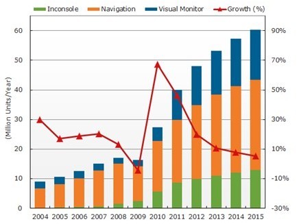 有鉴于使用在车上的电子产品日益增多,车用屏幕需具备多重功能--提供安全指示、动力信息、行车娱乐、以及其他行车所需信息。汽车导航器则因为能使驾驶员专注于道路行进,避开塞车和事故路段节省车程及时间,在全球的普及率也逐渐提高。