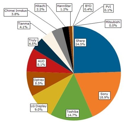 夏普、索尼、东芝等日本液晶显示器制造商都专注于发展车用液晶显示屏,不仅因为这些公司有能力产出高质量的中小尺寸面板,也可以取得较高获利空间。在车载应用上,夏普为领先厂商,拥有24.5%的市占率;索尼居次,为18.9%;东芝则有14.7%的市占率。
